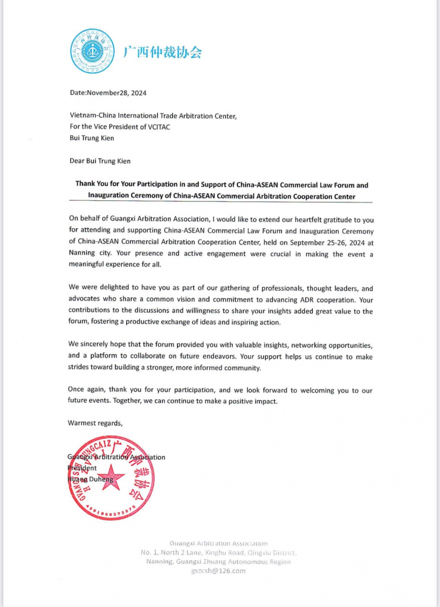Kết thúc chuyến viếng thăm, Hiệp hội trọng tài Quảng Tây đã gửi thư cảm ơn đến Trung tâm trọng tài thương mại quốc tế Việt Trung vì đã tham dự và ủng hộ nhiệt tình Diễn đàn pháp luật thương mại Trung Quốc - ASEAN. Thư cảm ơn bày tỏ sự trân trọng đối với những đóng góp quan trọng của Trung tâm trong việc thúc đẩy các hoạt động hợp tác, trao đổi kiến thức và kinh nghiệm giữa các chuyên gia, luật sư và trọng tài viên trong khu vực. Hiệp hội trọng tài Quảng Tây đánh giá cao sự tham gia tích cực của Trung tâm, đồng thời hy vọng rằng mối quan hệ hợp tác giữa hai bên sẽ ngày càng phát triển, góp phần nâng cao hiệu quả và sự phát triển bền vững của hệ thống trọng tài thương mại quốc tế trong khu vực ASEAN.